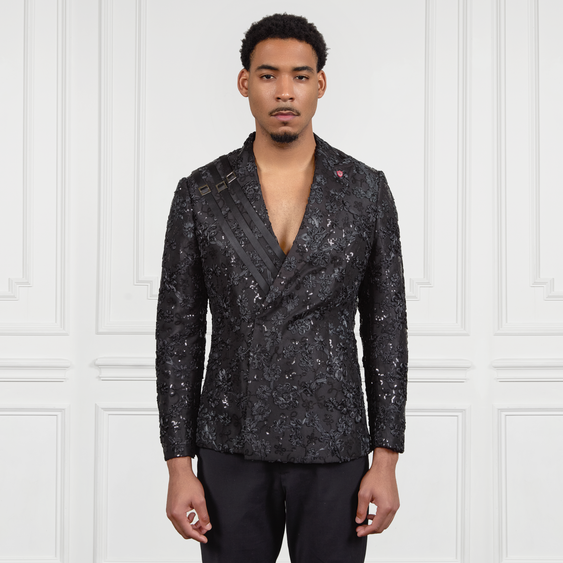 • Lapel: Wide, shawl lapel in matching black jacquard, enhancing the jacket's elegant and formal appeal.